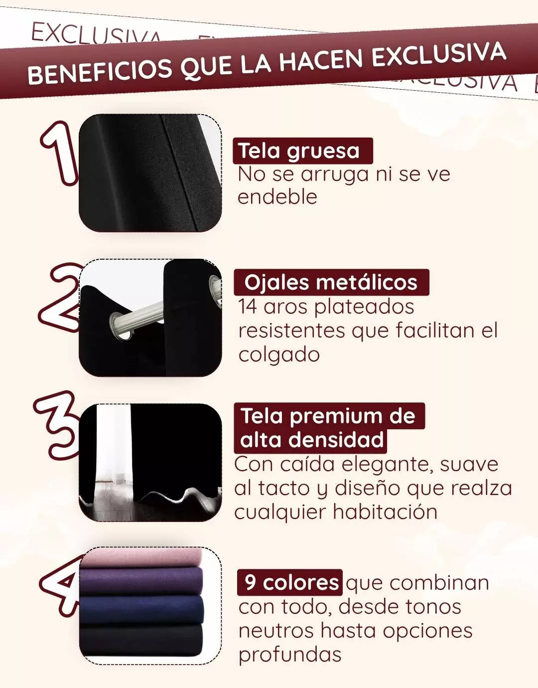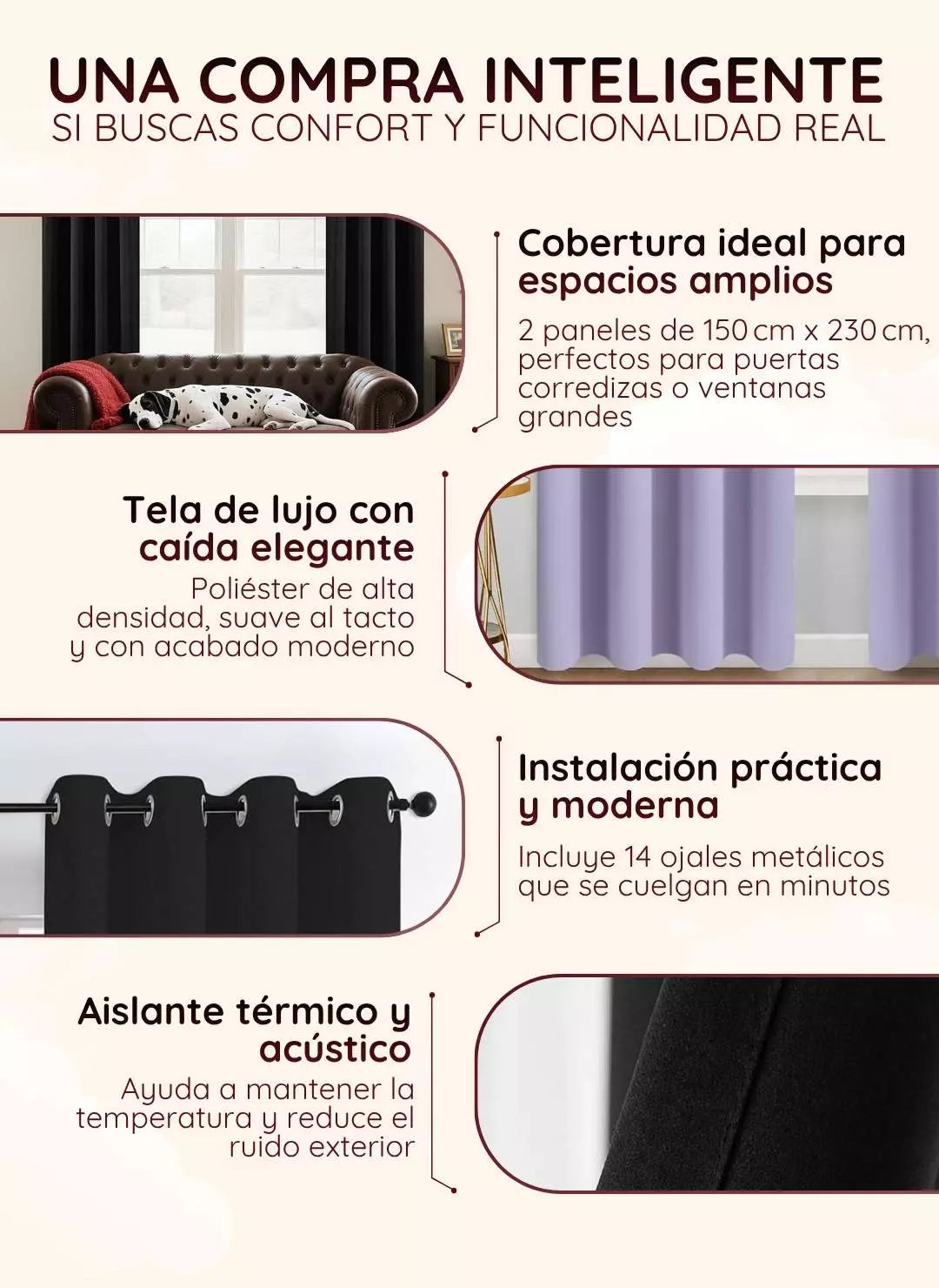 Sí — la oferta incluye dos paneles de 150 cm de ancho por 230 cm de alto (total cobertura aproximada 3 m de ancho), ideal para ventanas amplias o puertas corredizas. Solo asegúrate de tener espacio libre para colgar (ojo con rieles, barras o perfilería existentes).